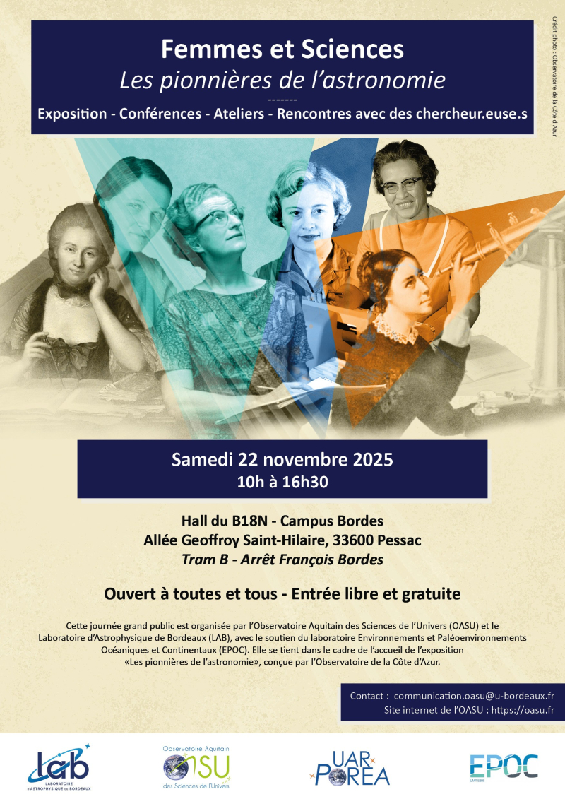 L’Observatoire Aquitain des Sciences de l'Univers (OASU) et le Laboratoire d’astrophysique de Bordeaux (LAB), avec le soutien du laboratoire Environnements et Paléoenvironnements Océaniques et Continentaux (EPOC), sont heureux de vous ouvrir leurs portes ! Rendez-vous le samedi 22 novembre 2025, de 10h à 16h30, pour une journée sur le thème "Femmes et Sciences, Les pionnières de l'astronomie".