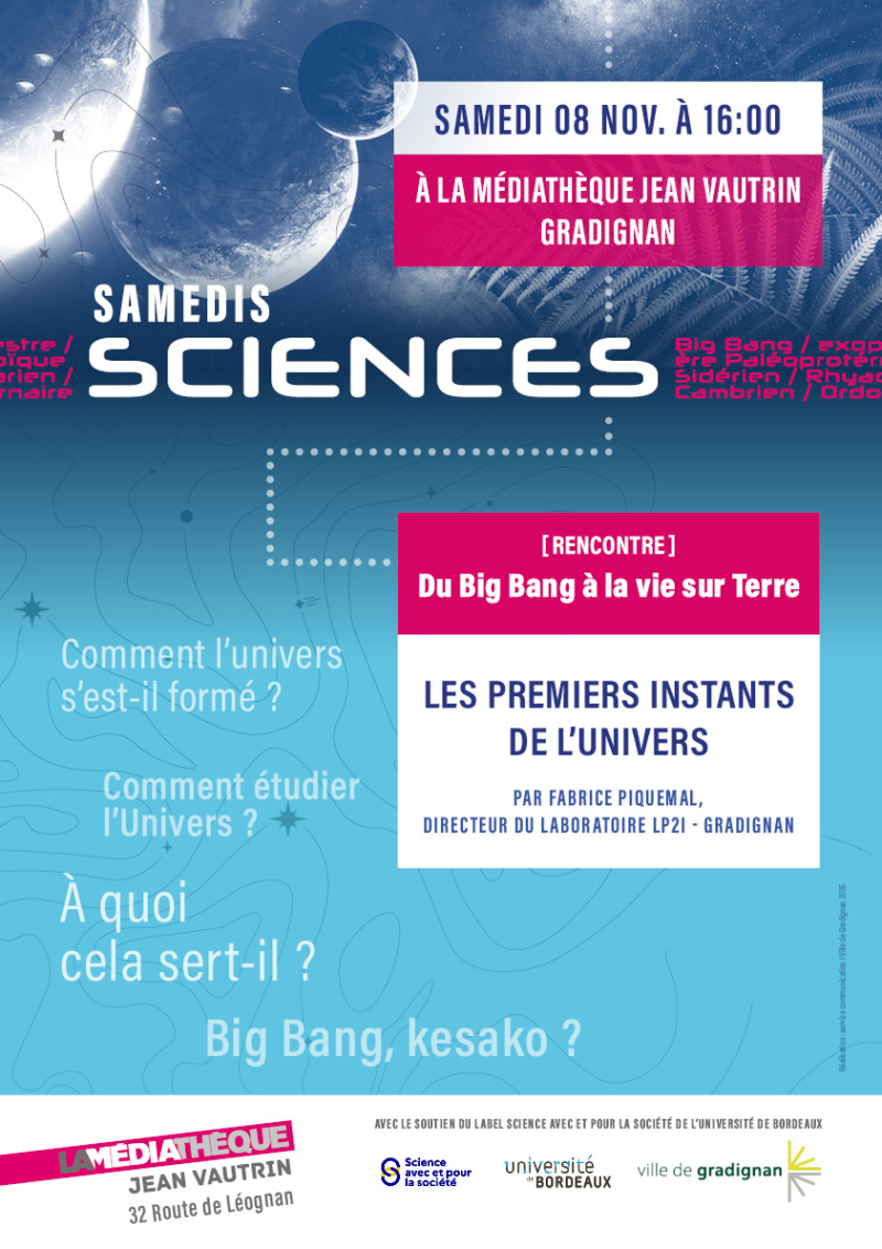 Pour ce premier Samedis Sciences de la saison 2025-2026, échangez avec Fabrice Piquemal, spécialiste dans la physique du neutrino, au sujet de la formation de l'univers. Rendez-vous à la médiathèque Jean Vautrin de Gradignan, samedi 8 novembre à 16h.